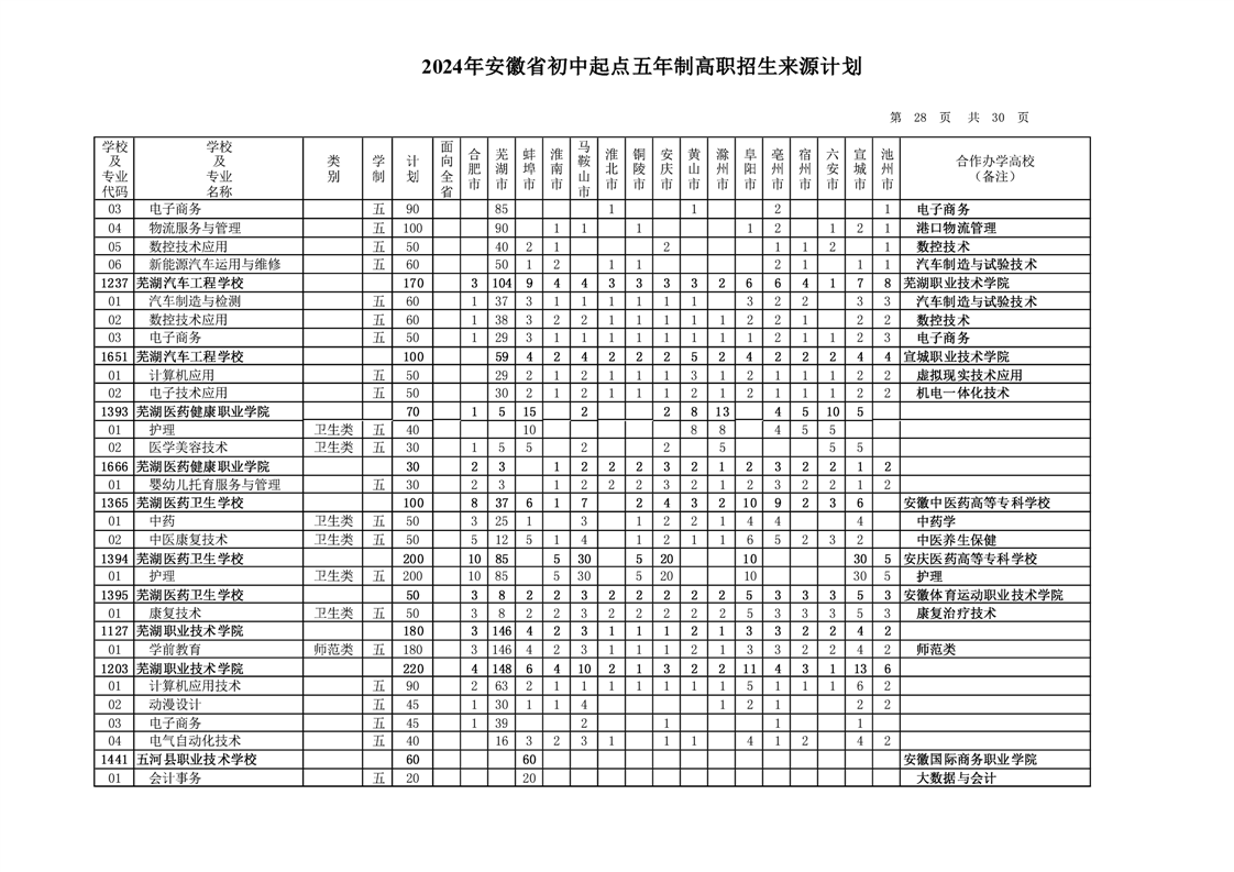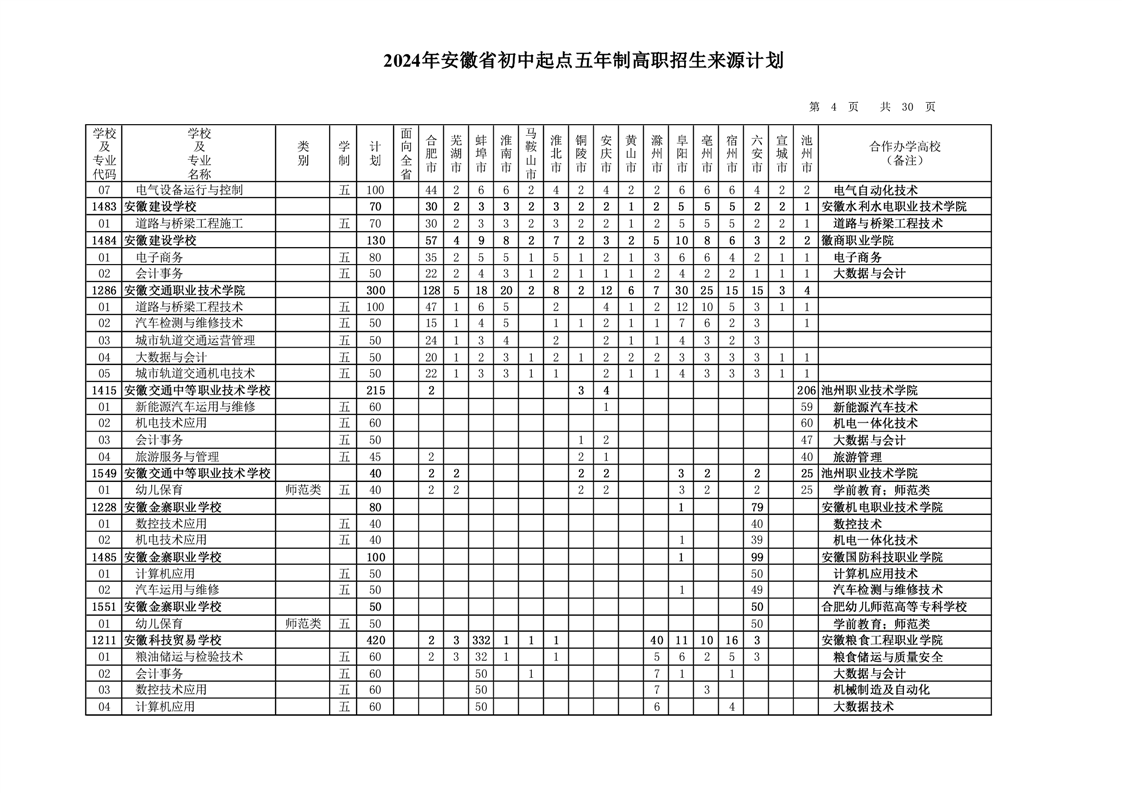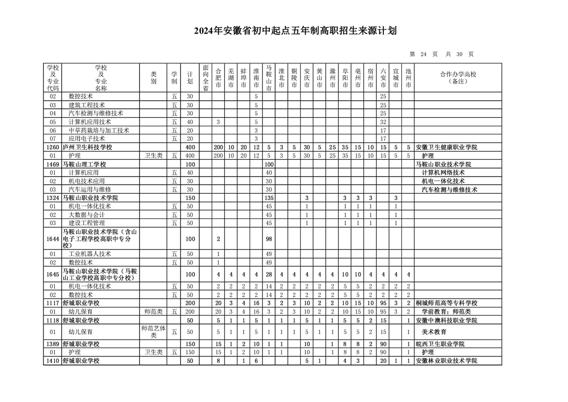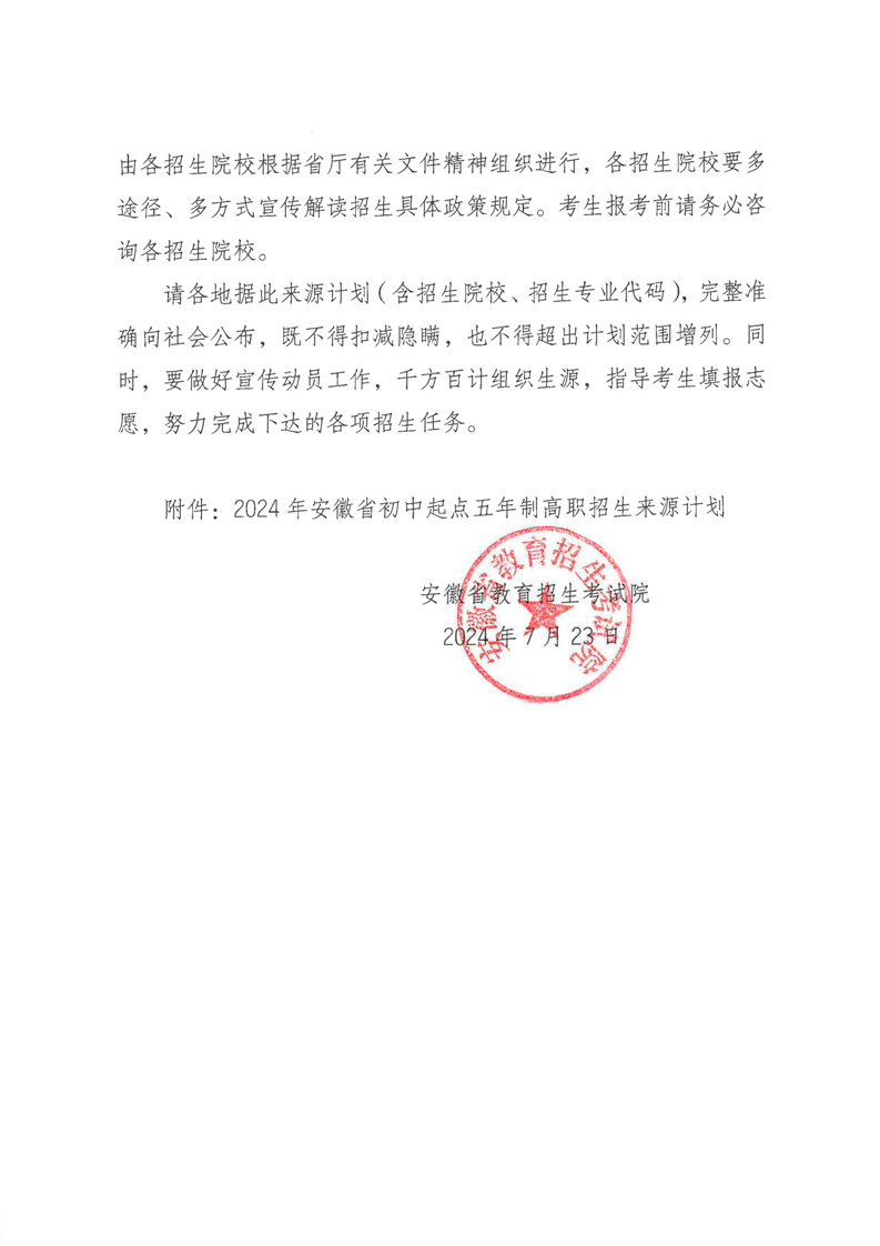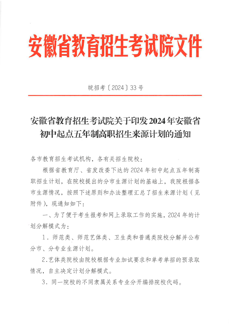 安徽省教育招生考试院关于印发2024年安徽省初中起点五年制高职招生来源计划的通知
