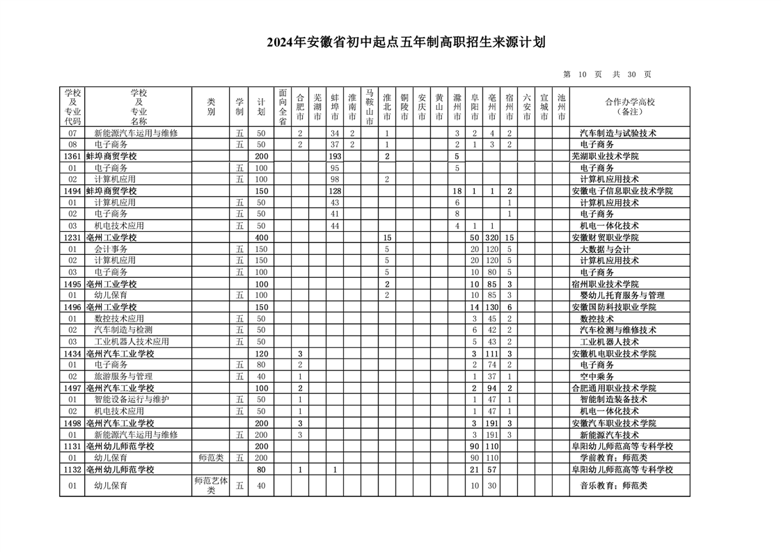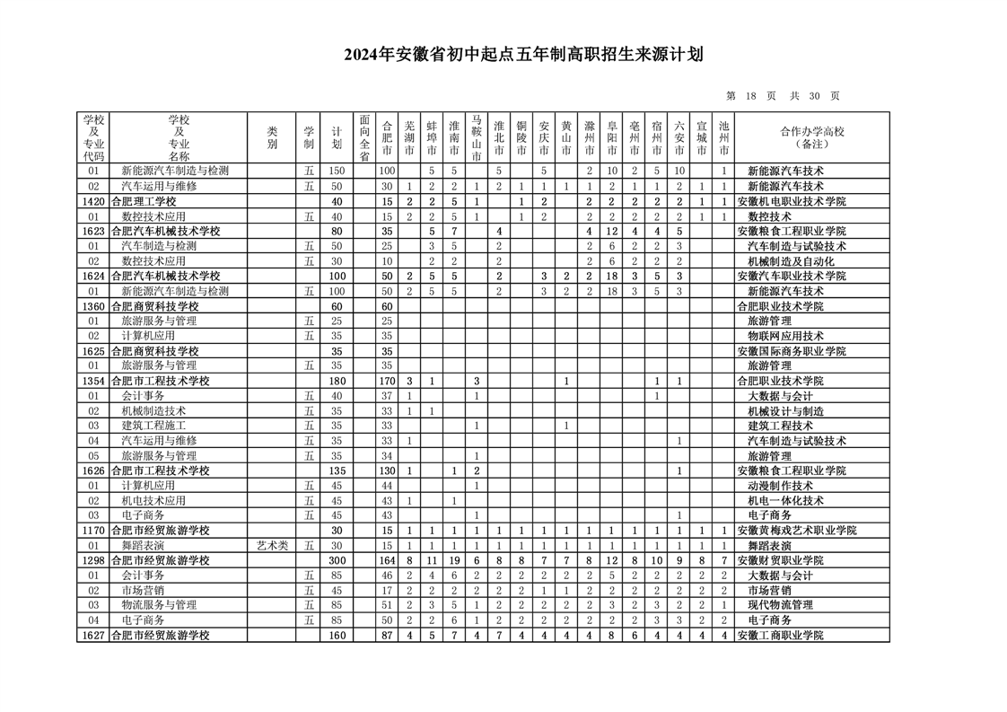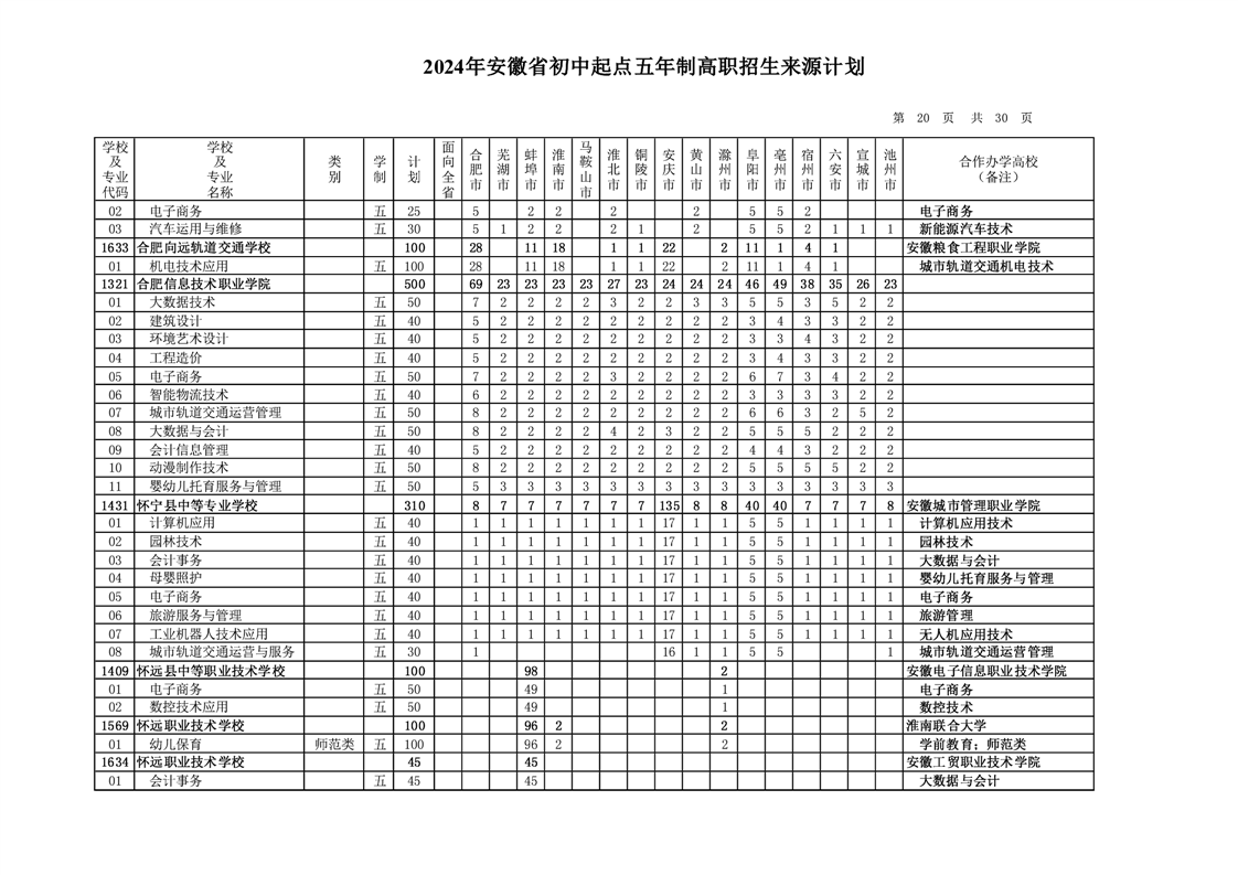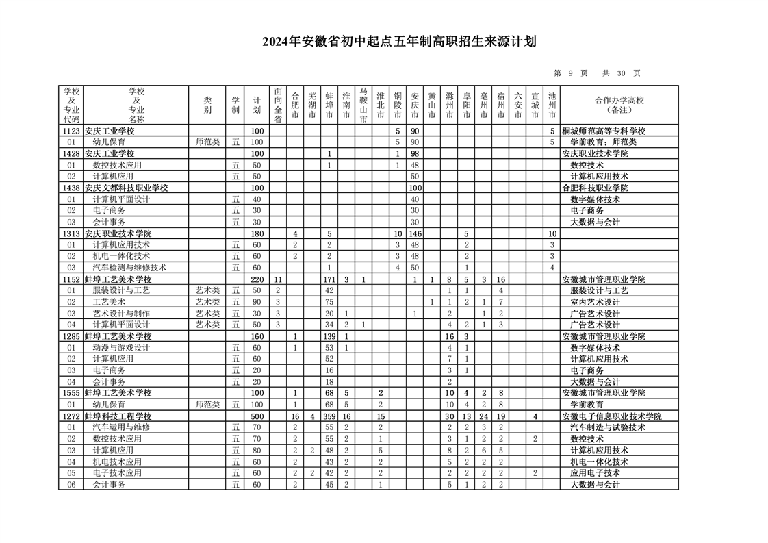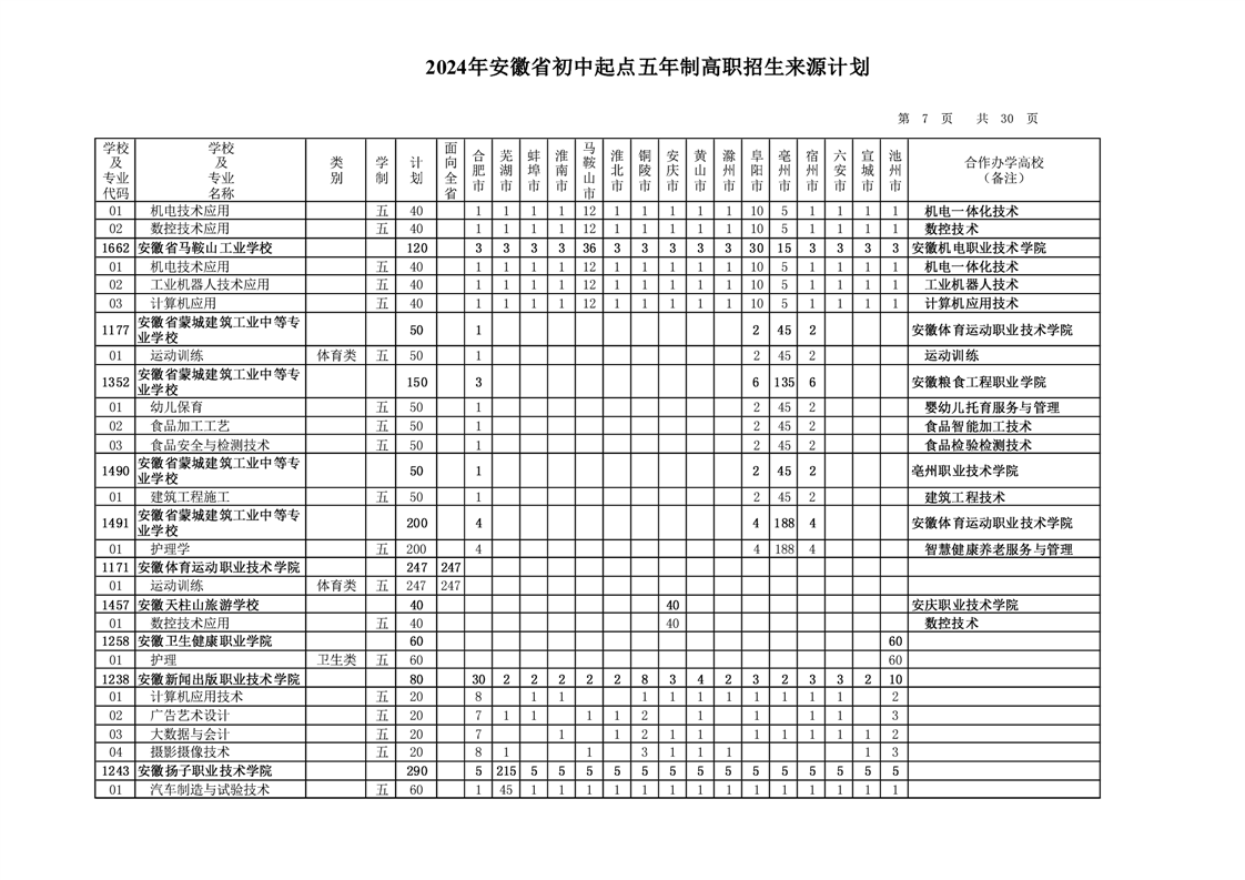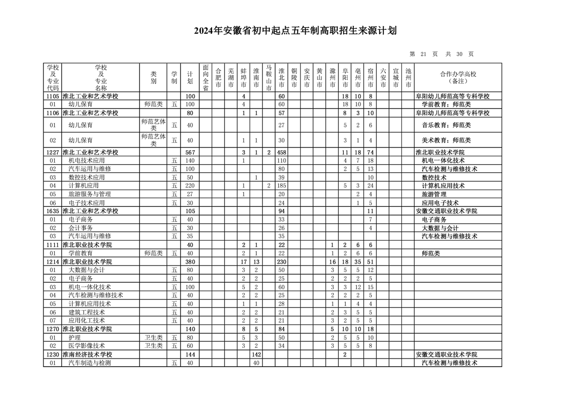 安徽省教育招生考试院关于印发2024年安徽省初中起点五年制高职招生来源计划的通知