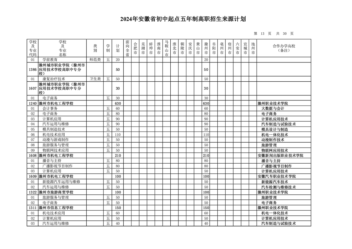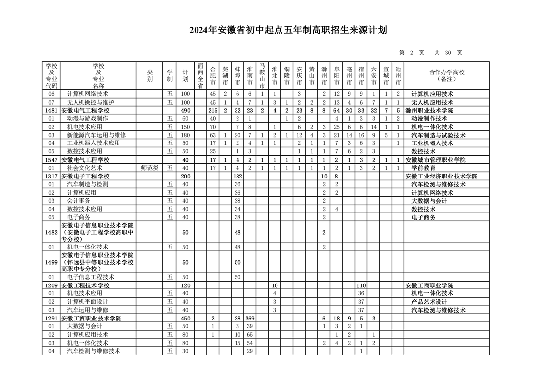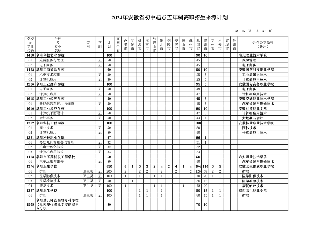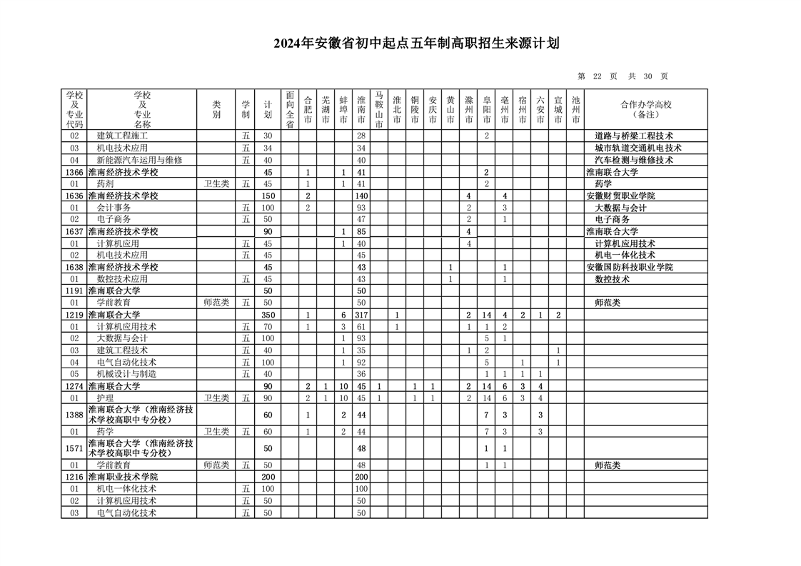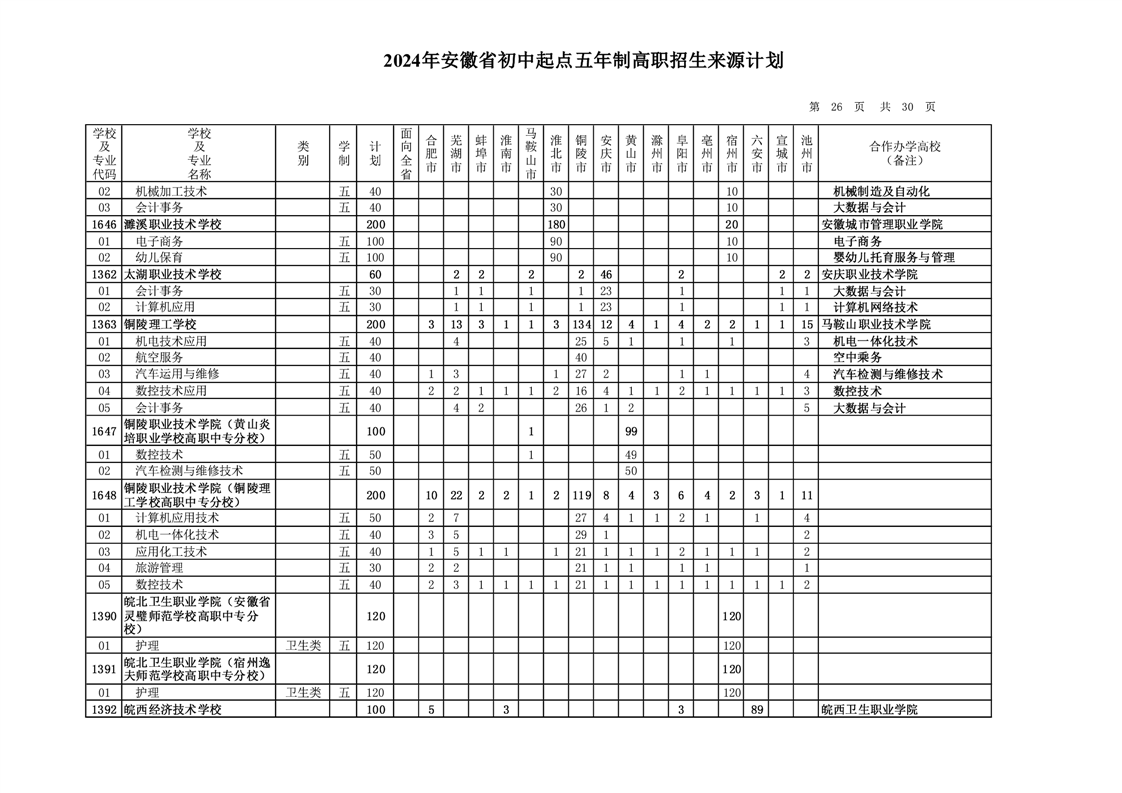 安徽省教育招生考试院关于印发2024年安徽省初中起点五年制高职招生来源计划的通知