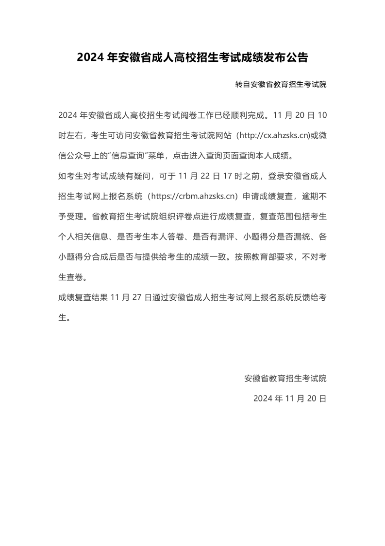 2024年安徽省成人高校招生录取最低控制分数线公布