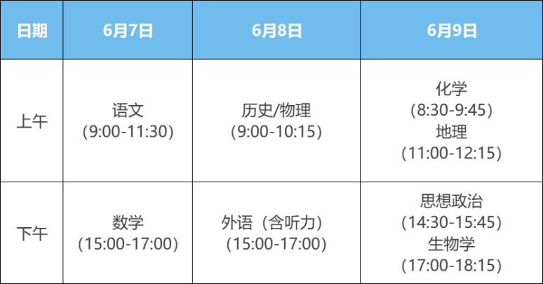 特别提醒✋🏽:考生可在考前40分钟(语文科目为考前45分钟)于考场前门入口处排队等候🫲👨🏻🏫,依次进入考场♥︎。各科目开考15分钟后(外语科目14时45分后)考生不得进入考点参加当次科目考试。语文、数学、外语3门科目交卷出场时间均不得早于考试结束前30分钟🎵,交卷出场后不得再进场续考,也不得在考场附近逗留或交谈🍞;物理、历史、化学📩、地理、思想政治、生物学6门科目不得提前交卷。