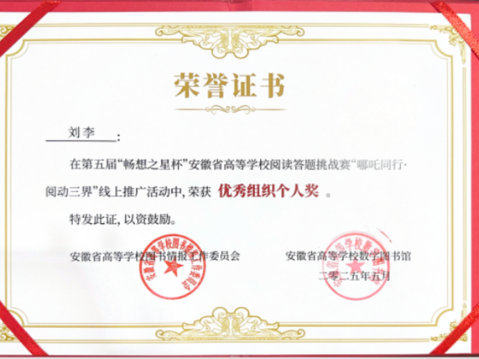 2025年3—6月🌥,由安徽省高校图工委联合畅想之星平台共同主办☝️,以“哪吒同行·阅动三界—阅读积分挑战赛”为主题的答题挑战赛落下帷幕。本次大赛旨在推动高校师生深入利用数字资源,培养终身阅读习惯🥼。活动涵盖在线打卡😶🌫️、阅读积分等多元形式🧑💻,共计吸引了安徽省83家图书馆📙、5794名师生参与。我校图书馆凭借出色的组织工作和师生的积极参与,荣获“阅读推广优秀组织单位”;刘李老师表现优异获得“优秀组织个人奖”🫃🏻。