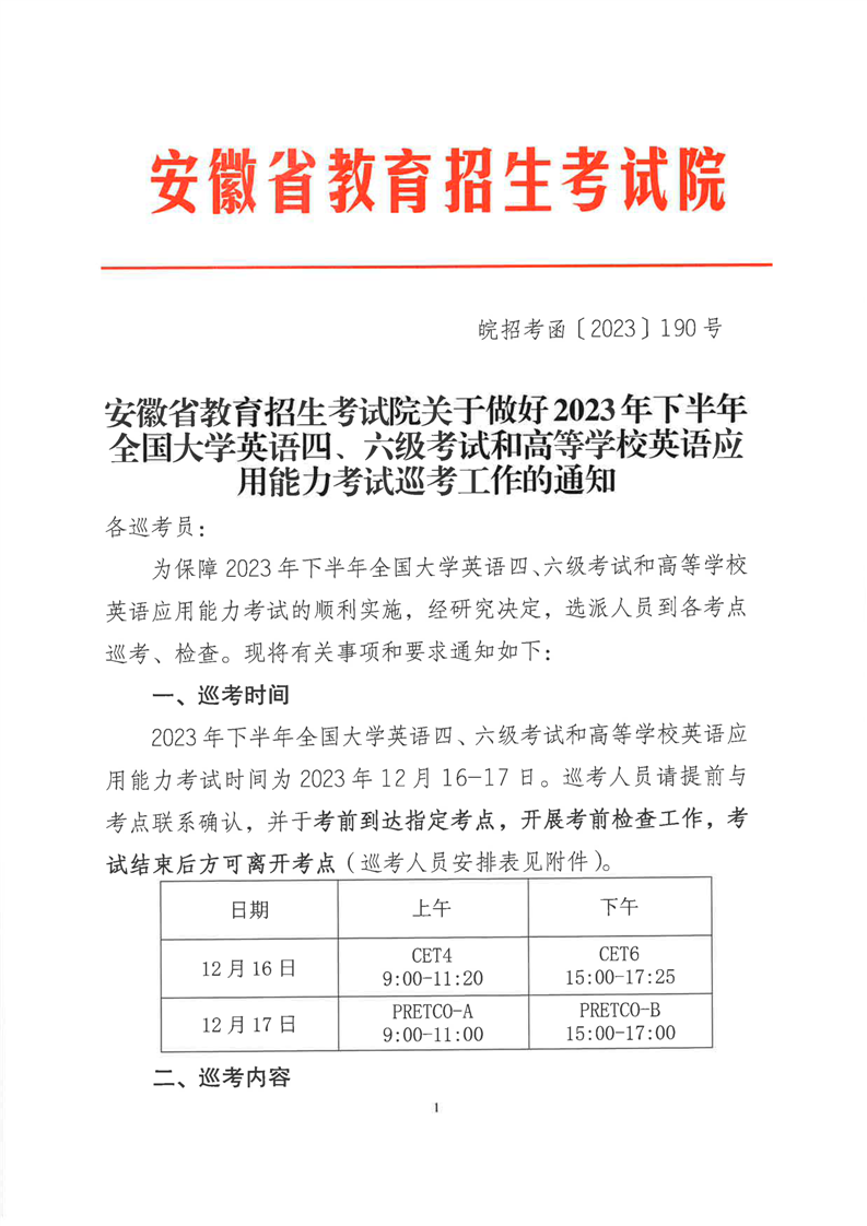安徽省教育招生考试院关于做好2023年下半年全国大学英语四、六级考试和高等学校英语应用能力考试巡考工作的通知