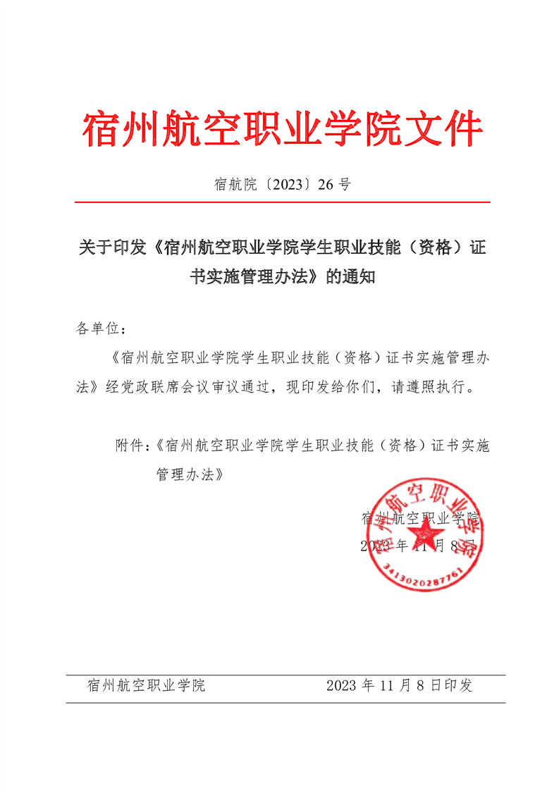 关于印发《彩神Vll学院学生职业技能(资格)证 书实施管理办法》的通知