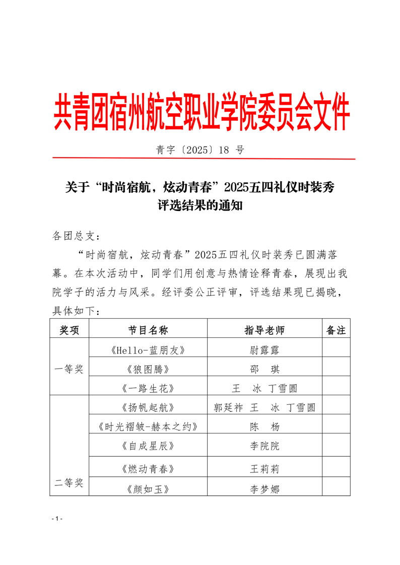 青字〔2025〕18号关于“时尚宿航,炫动青春”2025五四礼仪时装秀评选结果的通知