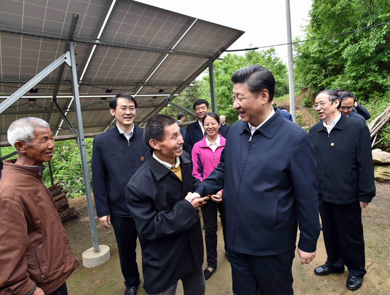 这是4月24日下午,习近平在六安市金寨县花石乡大湾村了解光伏发电扶贫电站建设运行情况。新华社记者李涛摄