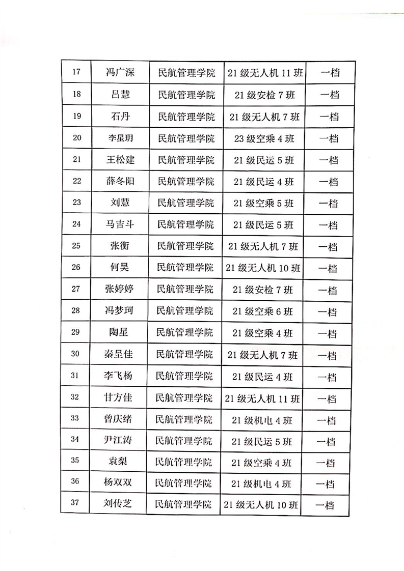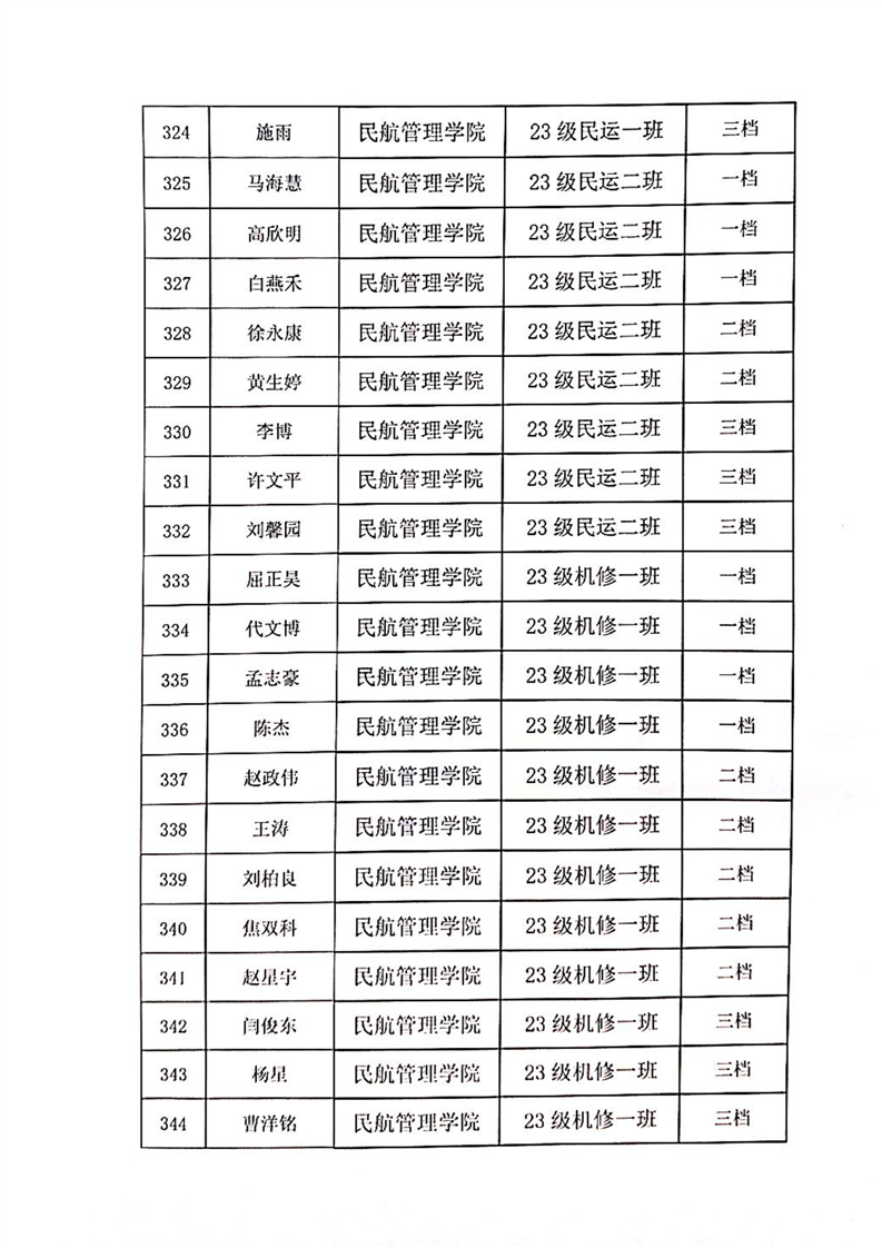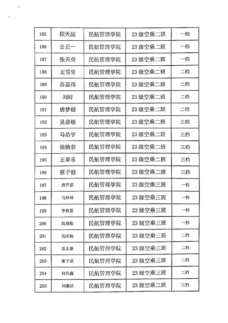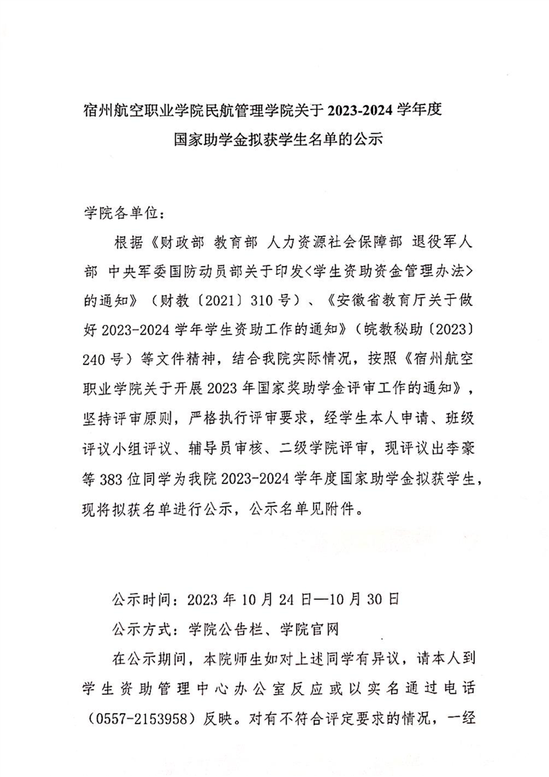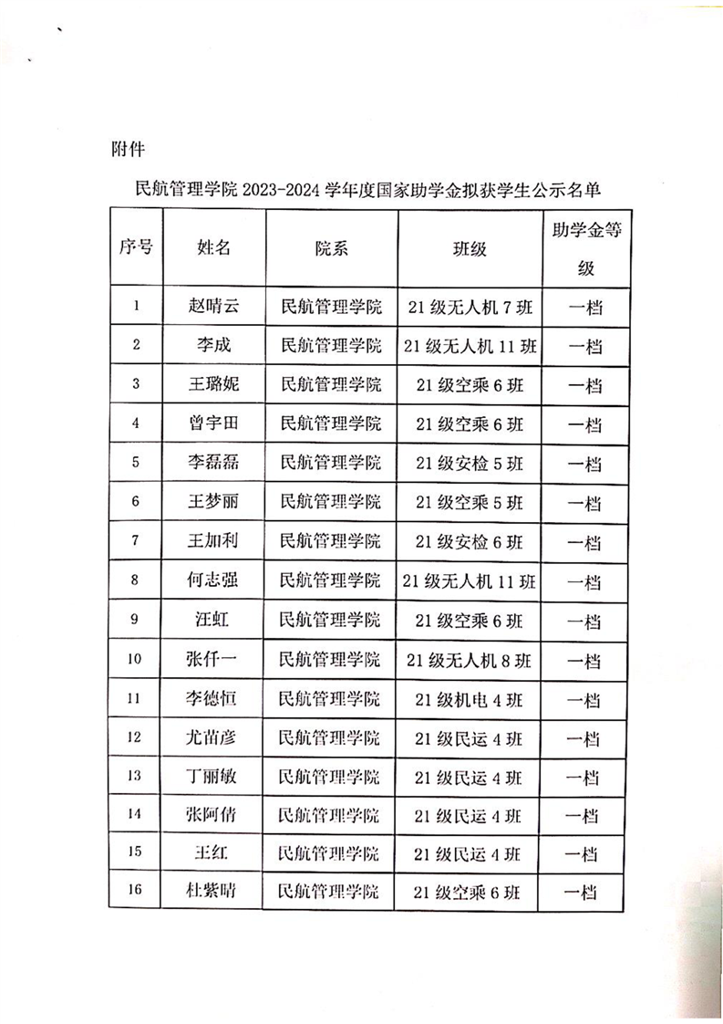 民航管理学院关于2023-2024学年度国家助学金拟获学生名单的公示