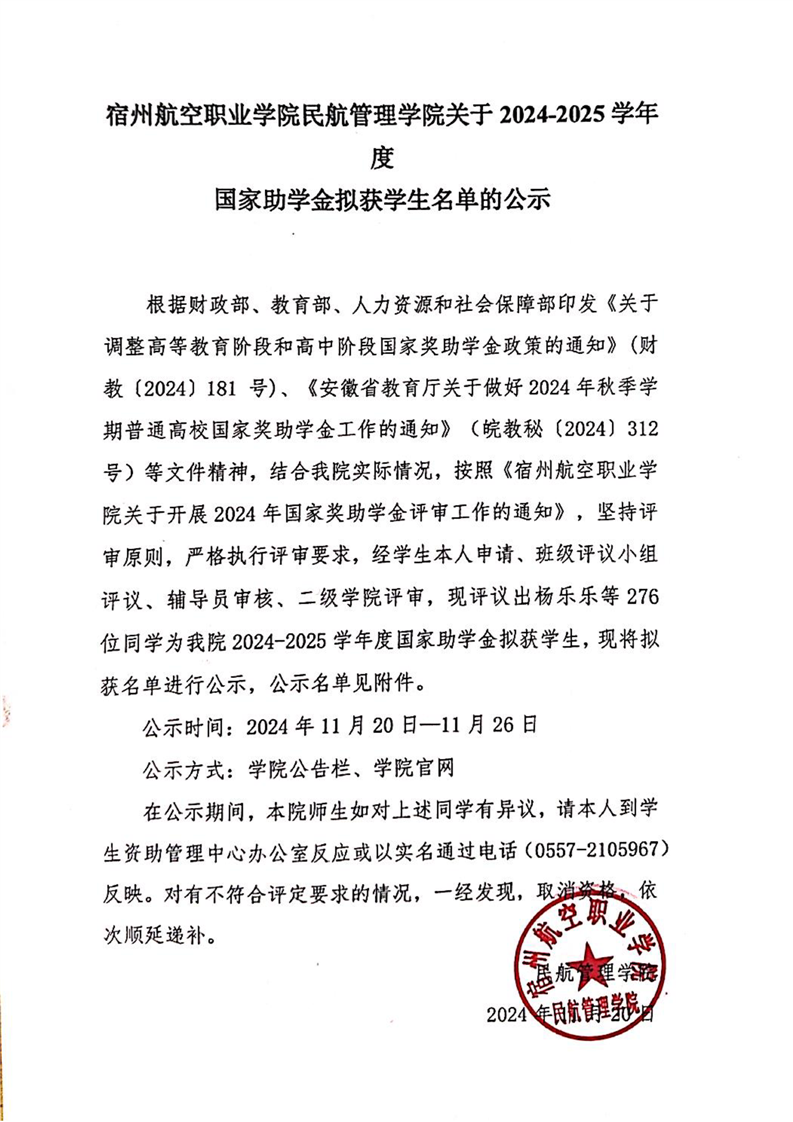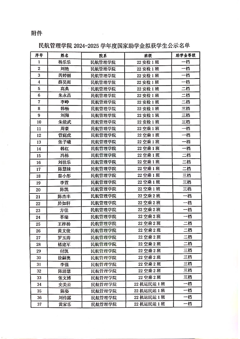 彩神Vll学院民航管理学院关于2024-2025学年度国家助学金拟获学生名单公示