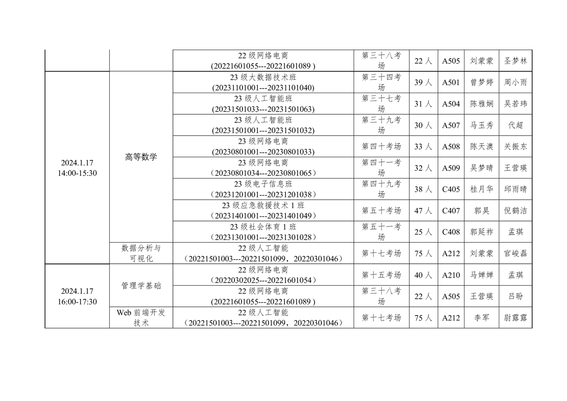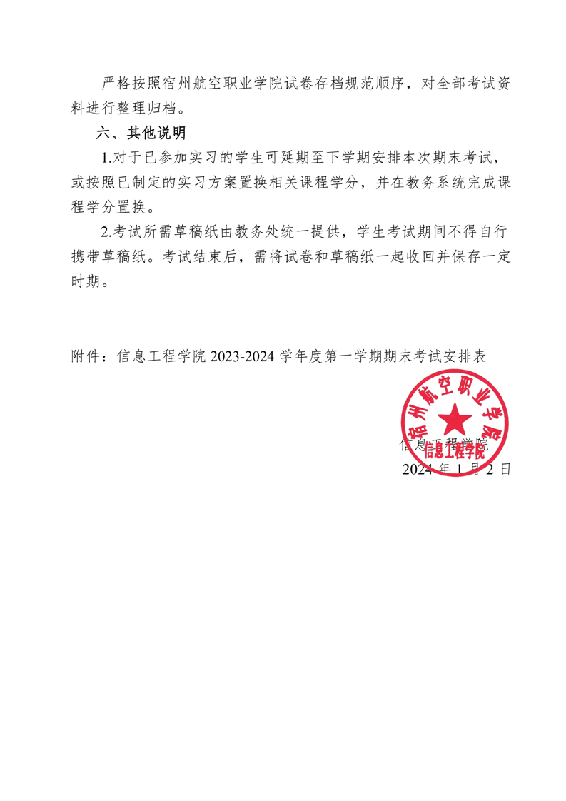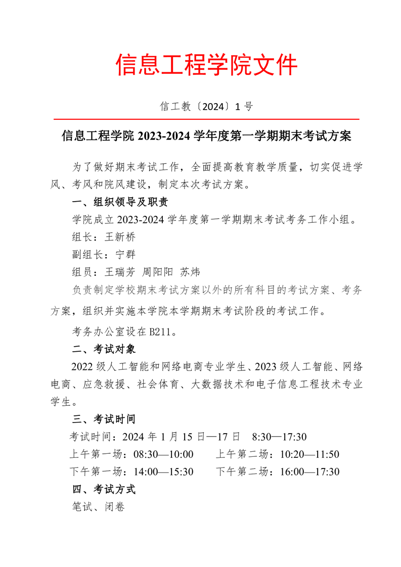 信息工程学院2023-2024学年度第一学期期末考试方案