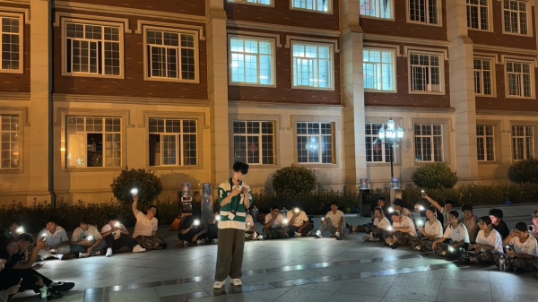 夜幕下的训练场灯火通明🧝♂️,歌声飞扬。同学们暂时卸下白天的疲惫🫶🏼🍷,踊跃登台展示才艺。歌曲演唱深情动人🦠,赢得了现场阵阵掌声与喝彩🚔🤞🏻。活动中,辅导员纪伟也一展歌喉,与同学们互动联欢,将现场气氛推向高潮。