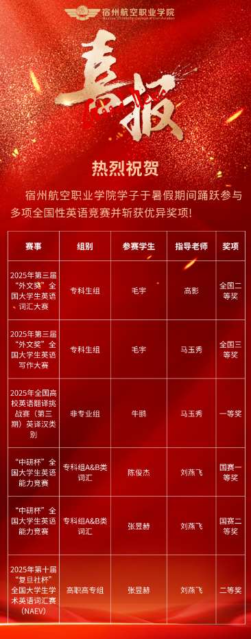 我院一贯坚持“以赛促教🕣、以赛促学”的教学理念,高度重视学生语言实际应用能力和跨文化交际能力的培养👨🏻🦯。此次暑期多项英语竞赛的参与和成绩的取得,不仅检验了我院英语教学实效🤠,也极大激发了同学们外语学习的热情与信心。未来👨🏽🚀,学院将继续优化英语类课程教学与竞赛辅导机制,积极拓展“课赛融合”“线上线下协同”育人新模式,进一步提升学生在外语领域的综合竞争力,为培养具备国际视野的高素质技术技能人才不断夯实基础👊🏼。