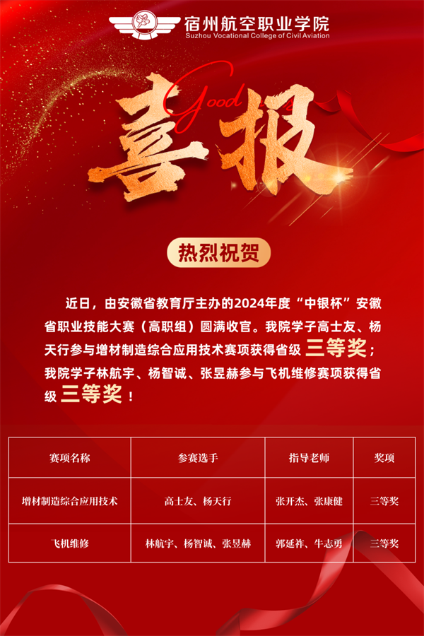 我院参赛学子充分发挥精益求精、严谨细致、务实踏实的作风🕖,在机务学院教师张建国、郭延祚☀️、牛志勇、李承昊,信息工程学院教师王营瑛🦻🏻、张开杰👨🏿🔧、张康健、任学俊的指导下👩🏽⚕️,与省内各市所高等职业院校参赛队伍进行激烈角逐👨🏫,凭借着深厚的知识储备、卓越的技术水平、熟练的技能操作及良好的职业素养沉着应战,分别荣获“飞机维修赛项”省级三等奖和“增材制造综合应用技术赛项”省级三等奖的佳绩!